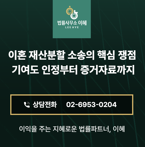 ☎ 법률사무소 이혜는 이혼 사건을 다수 처리한 경험을 토대로, 재산목록 확정부터 기여도 입증 자료 준비, 은닉재산 추적, 가압류 신청까지 체계적으로 조력하여 정당한 재산분할을 받을 수 있도록 돕겠습니다.